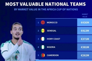 体育资讯12月25日讯 德国转会市场列出了非洲杯球队身价排名前十,摩洛哥居首,塞内加尔、科特迪瓦二三位。