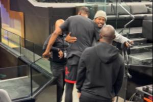 赛前,比尔与杜兰特拥抱致意,两人在太阳做过队友。