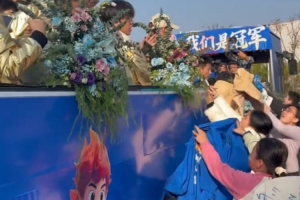 载誉归来的永州队球员乘坐花车回城,沿途市民早早守候,夹道欢呼,用热烈的掌声与呐喊,迎接冠军英雄的到来。