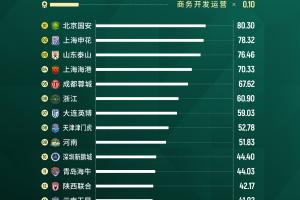 上海海港、成都蓉城 、浙江和大连英博分别位列四、五、六、七名,天津津门虎、河南位列第八和第九。