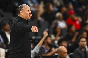 “所以就是坚持我们的既定路线,我们遇到了一段艰难时期,这个赛季很艰难,遭遇各种伤病,起起伏伏,输掉一些比分接近的比赛,但就是要坚持下去,我们必须成为把自己拉出困境的人,所以我要赞扬小卡和哈登,你知道,他们功不可没。”